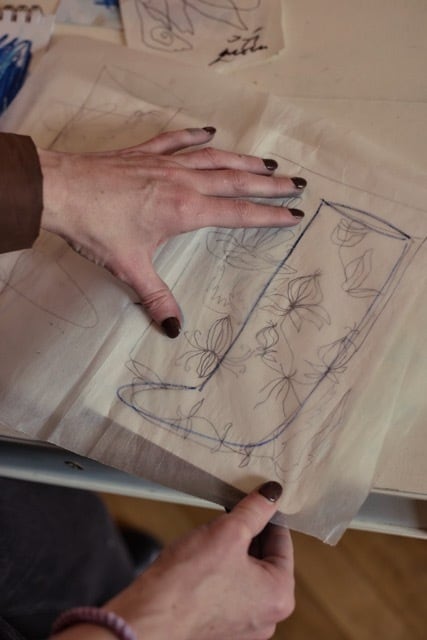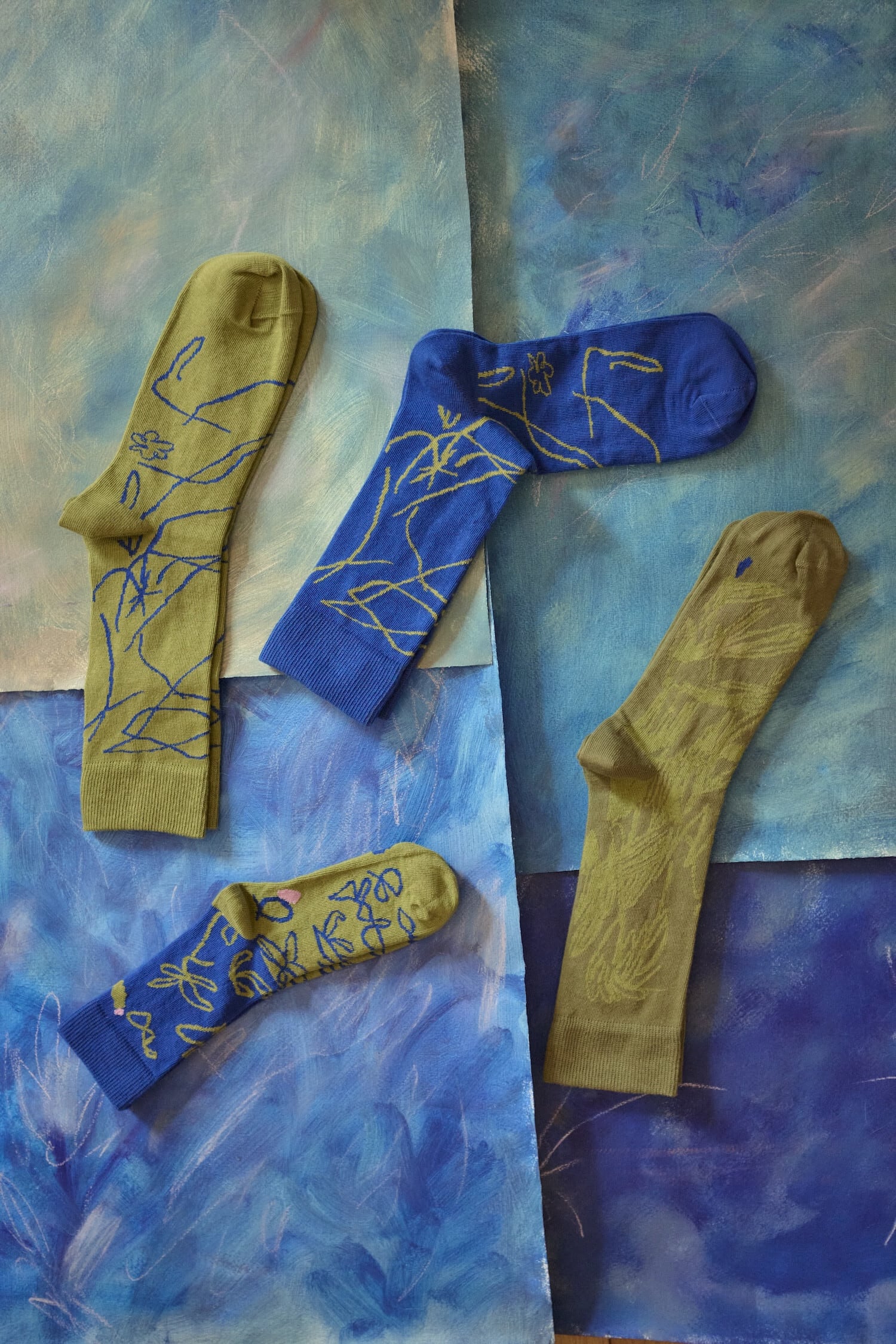 抽象画のようにも、見方を変えるとパンジーの花が舞うようにも見えるソックス。プラハ拠点のアーチスト、 カテリーナ・ドブロシュラヴァ・ドラホショヴァによるデザインで、線・面・構造を手段に用いて、シンプルで簡潔な表現で現代を描いたドローイングです。