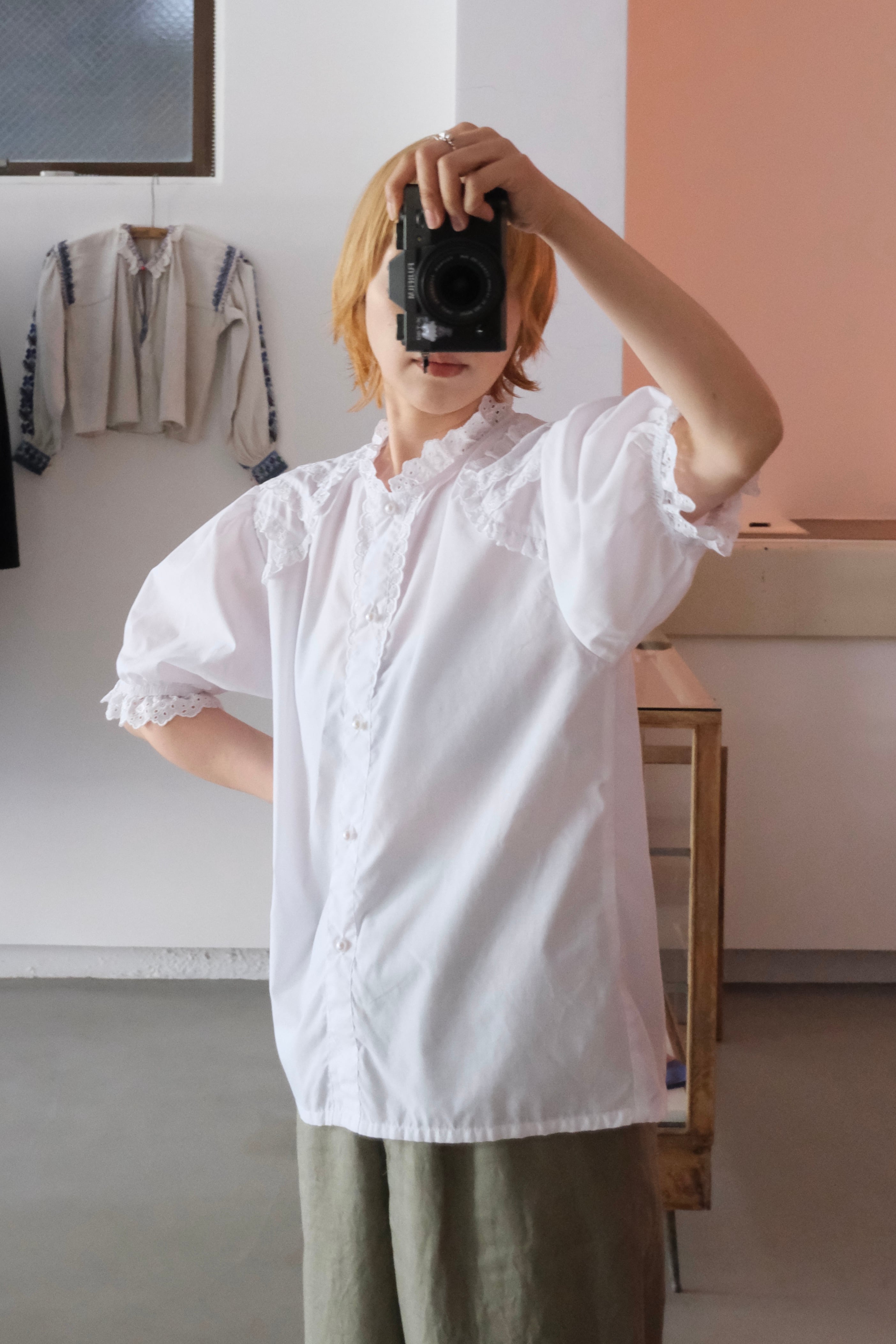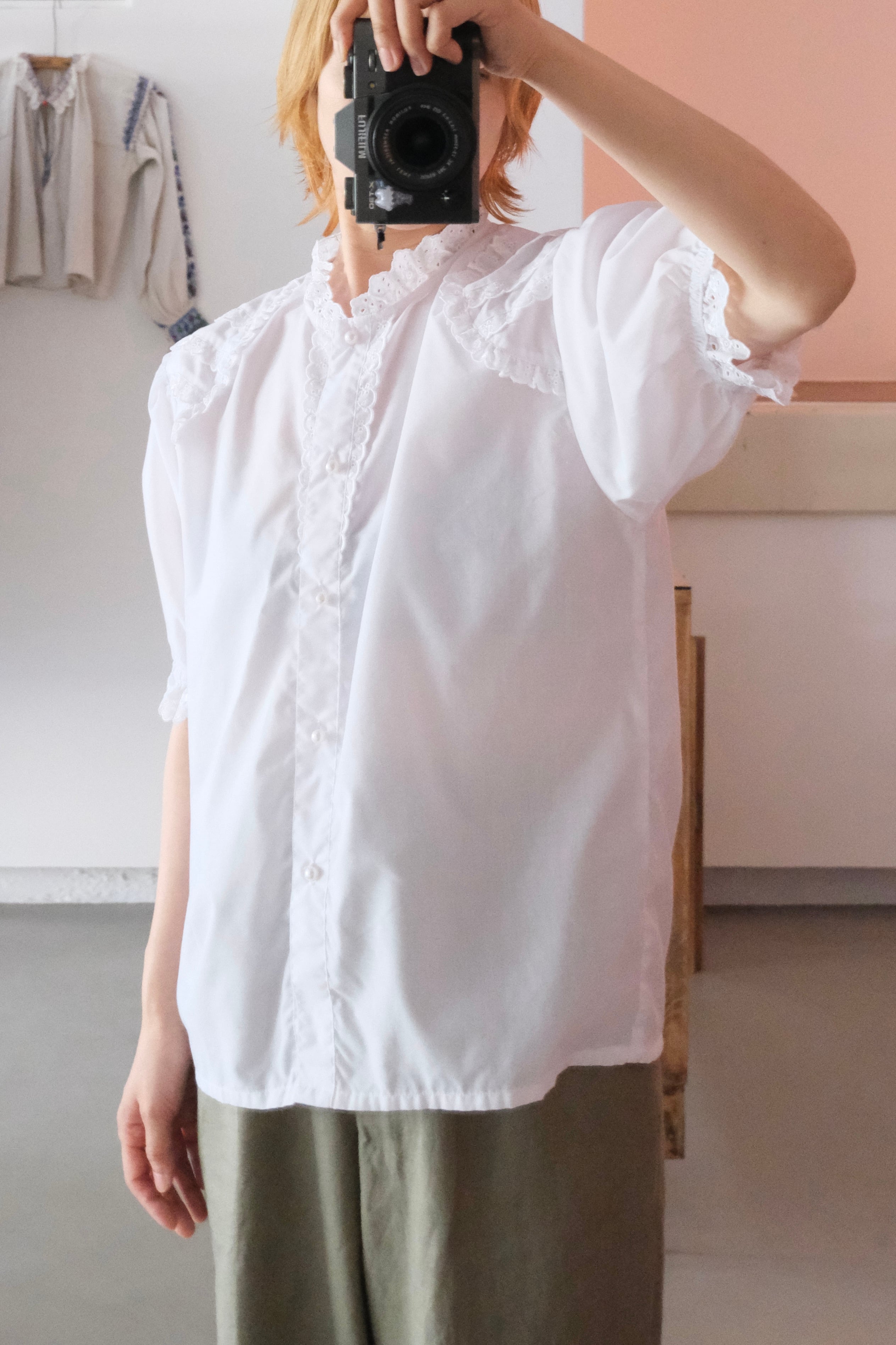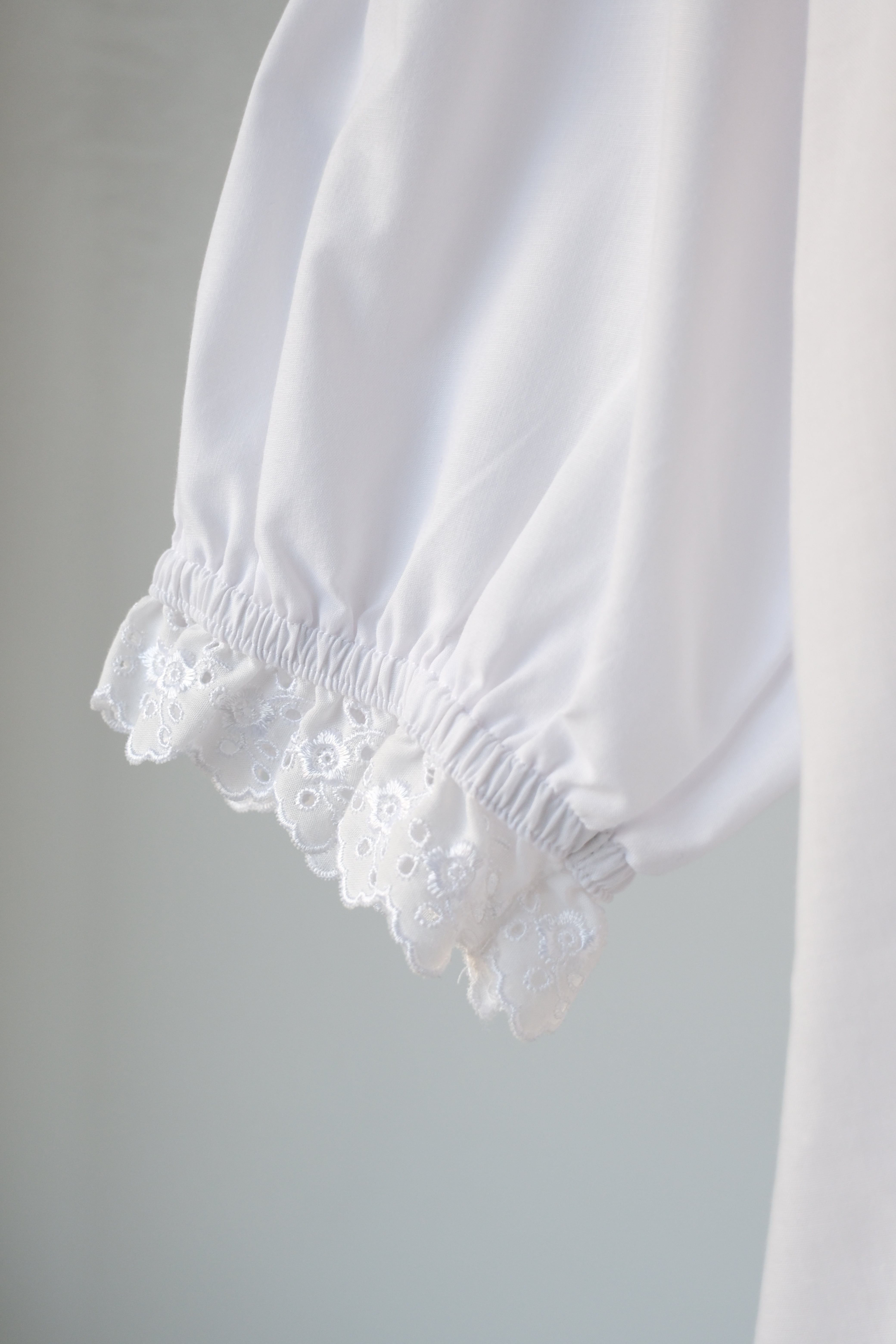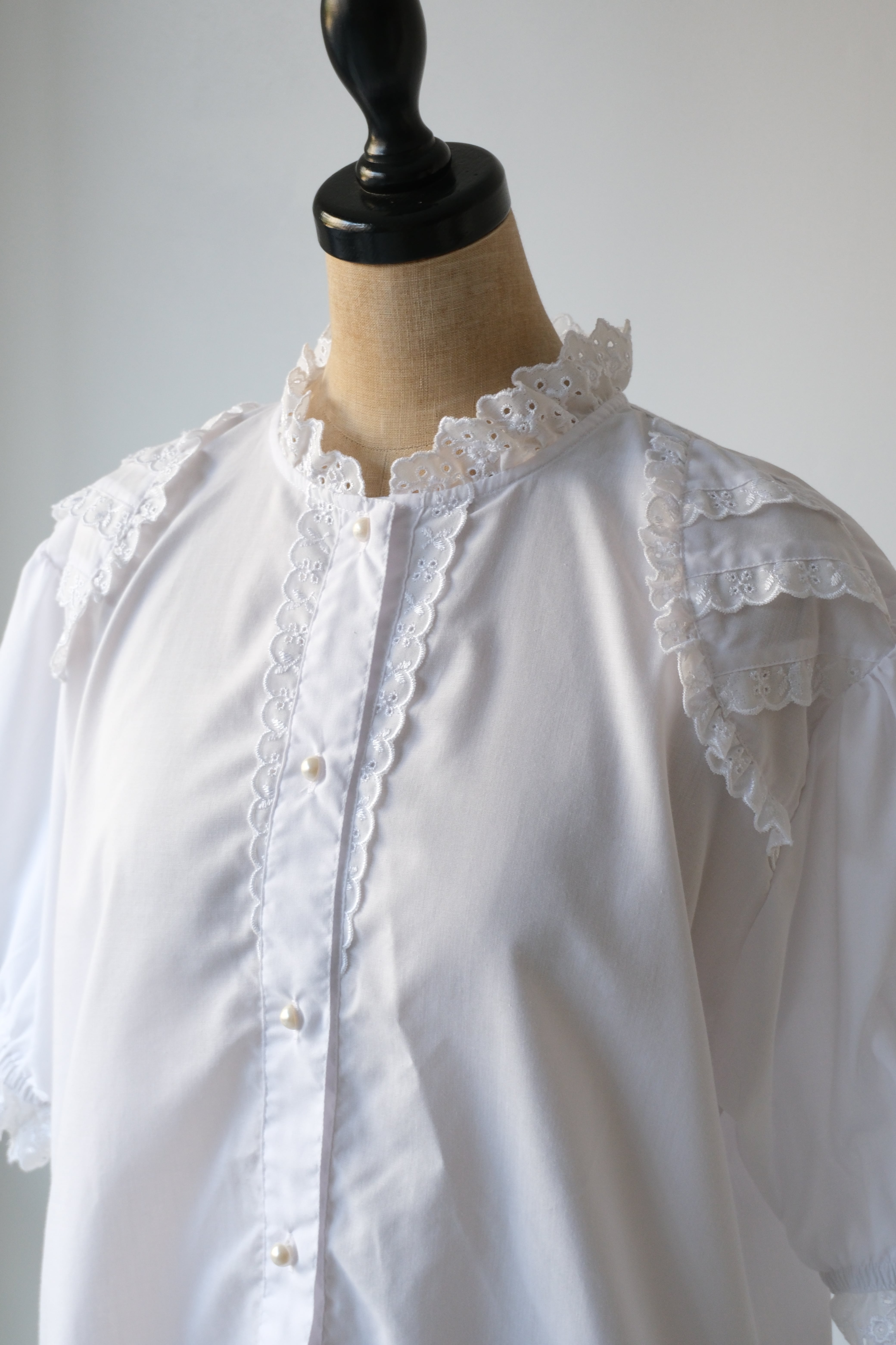 繊細なアイレットレースとパールボタンのパフスリーブブラウス。こちらはフィンランドで買い付けた一着です。