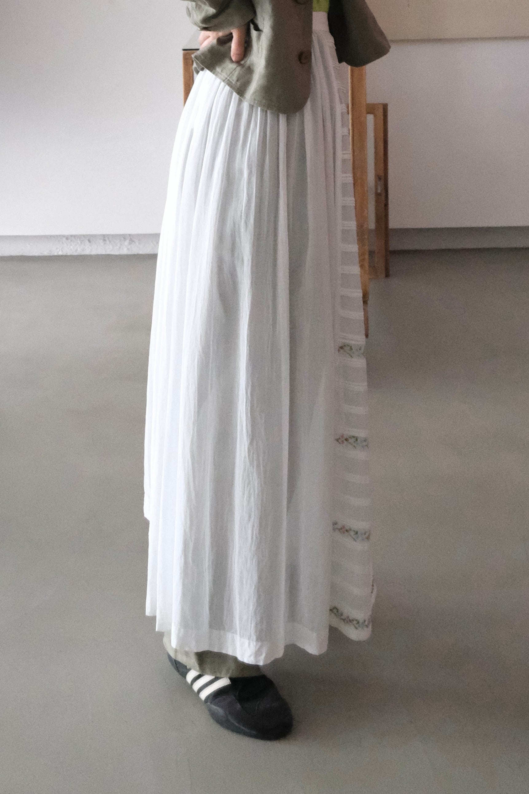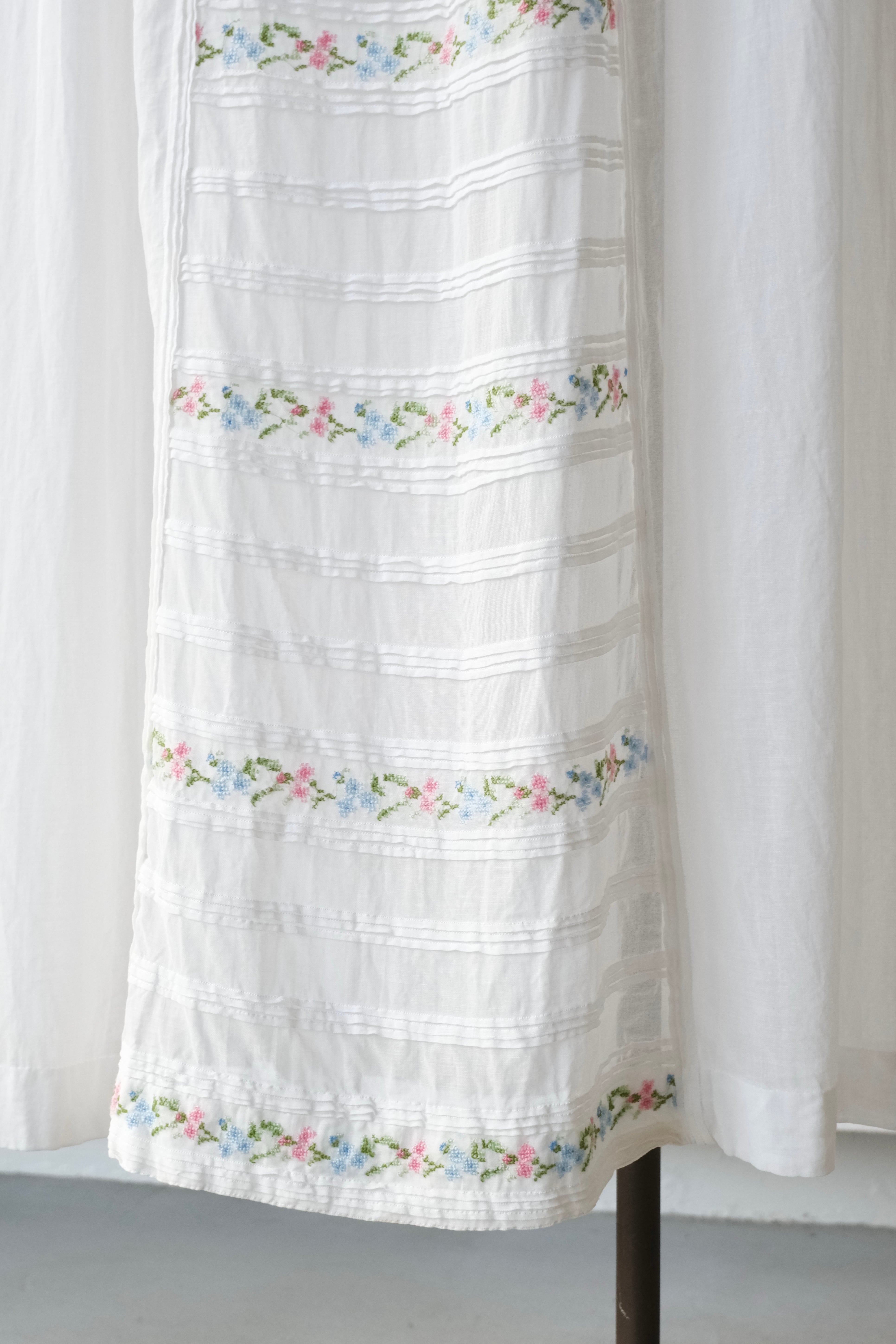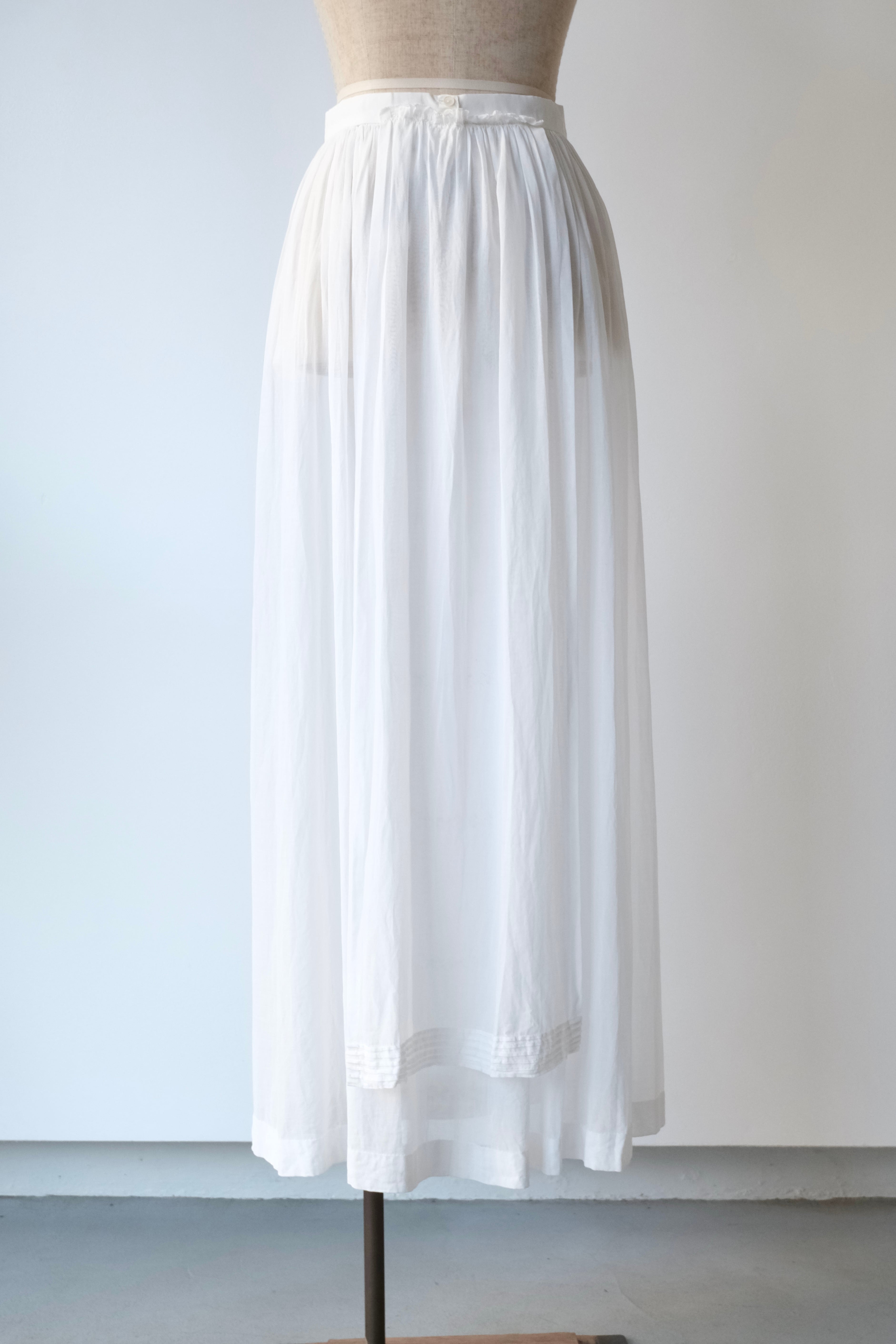 フィンランドで見つけた古いベビードレスを、当店でリメイクしたスカートです。ドレスのアームホール下からの部分にウエストを取り付け、オリジナルの繊細なギャザーを生かしたスカートに仕立てました。