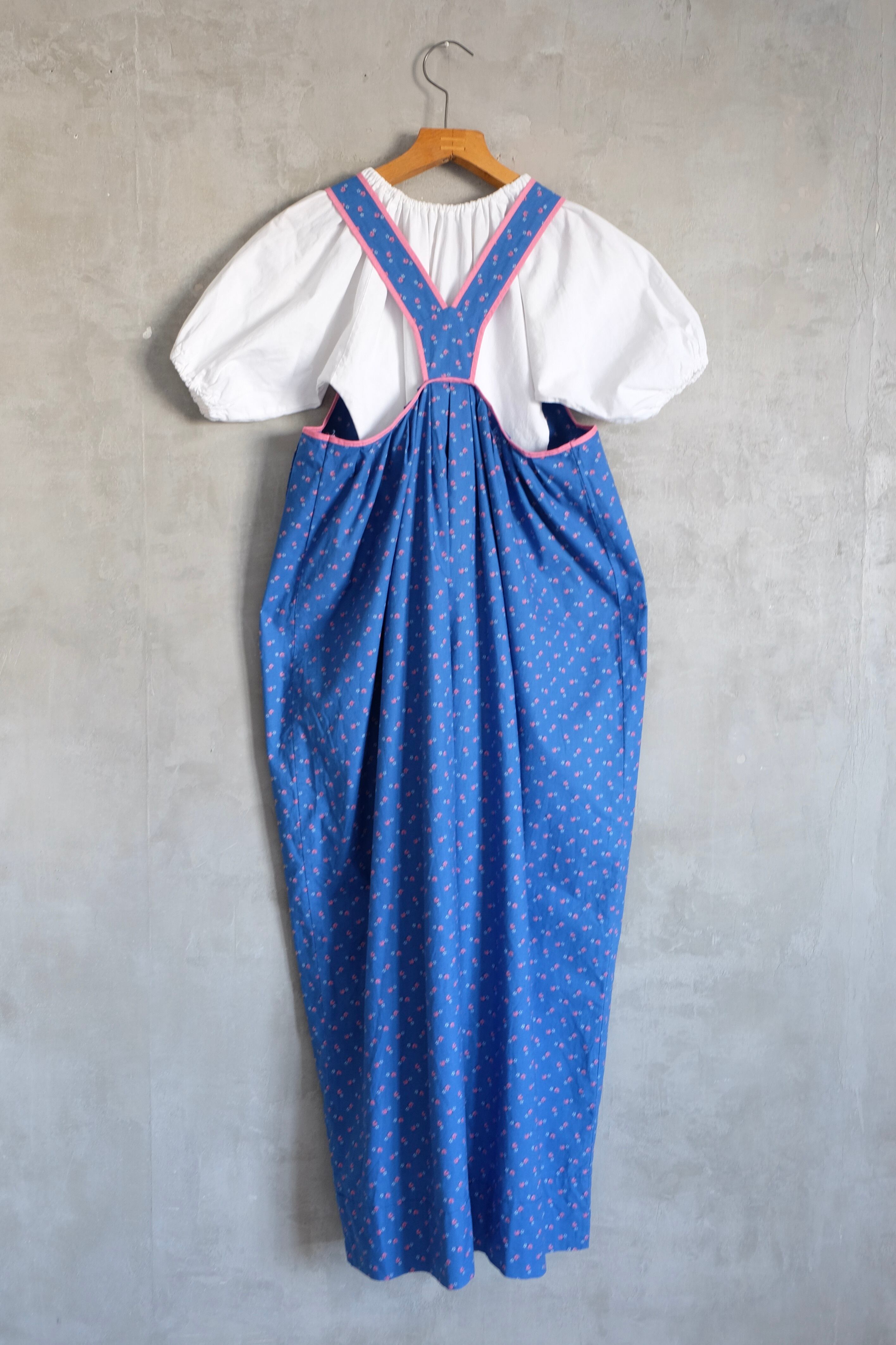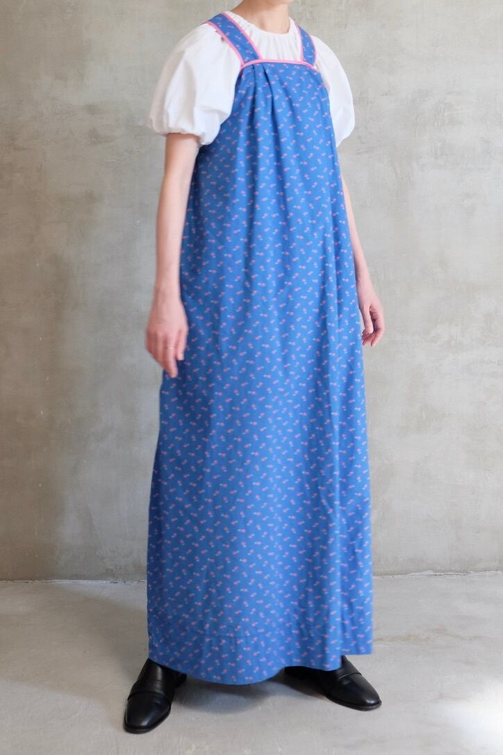 小花柄がプリントされた鮮やかなライトブルーの生地に、ピンクのパイピングによるアクセントカラーがよくマッチした愛らしい雰囲気ですが、マキシ丈なので大人の女性にも楽しんでいただけるはず。生地はしっとりとした手触りのコットン素材。裏地は付いていませんが、一枚で着ても透けない程度の厚みはあります。身幅が比較的広く取られているので、冬は厚手のニットを合わせたコーディネートもおすすめ。