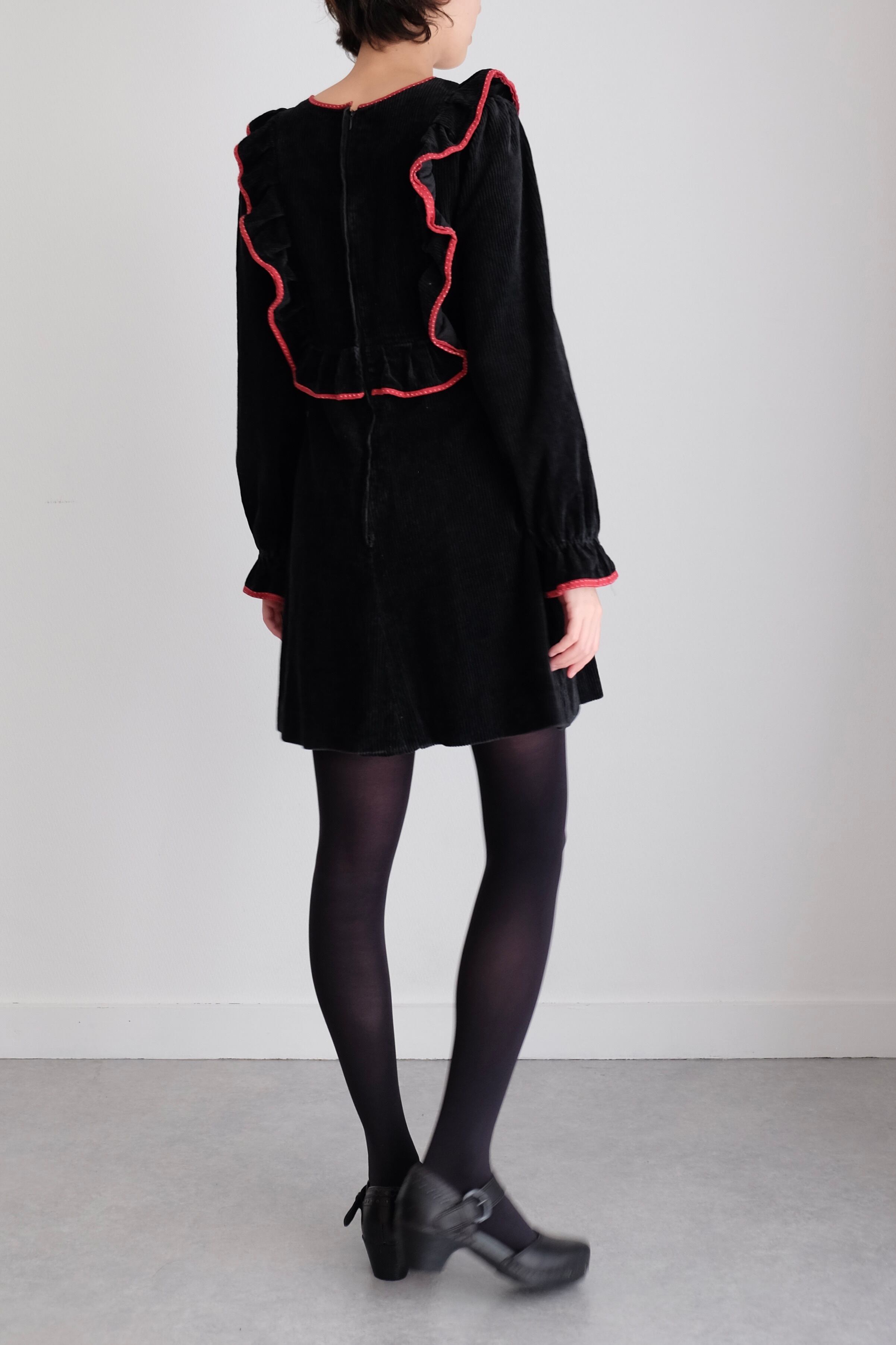 そんなコーデュロイの黒の良さが詰まったこのアイテムは、着る人によってひざ上丈のミニドレスにも、チュニックにもなる一着。肩周りにあしらわれたフリルと、主張しすぎないAラインのシルエットがほどよい愛らしさで、そのまま一枚で着る以外にも幅広いコーディネートで絶妙なアクセントアイテムとして活躍しそう。赤いパイピングは、アクセサリーを付けたかのような存在感を放ちます。
